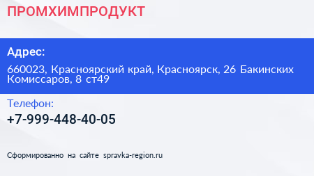 ПРОМХИМПРОДУКТ по адресу 660023, Красноярский край, Красноярск, 26 Бакинских Комиссаров, 8 ст49 в дальнейшем Организация, размещена в следующих категориях: