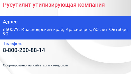 Русутилит, утилизирующая компания по адресу 660079, Красноярский край, Красноярск, 60 лет Октября, 90 в дальнейшем Организация, размещена в следующих категориях: