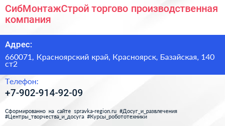 СибМонтажСтрой, торгово-производственная компания по адресу 660071, Красноярский край, Красноярск, Базайская, 140 ст2 в дальнейшем Организация, размещена в следующих категориях: