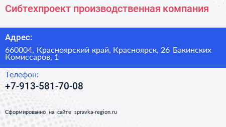 Сибтехпроект, производственная компания по адресу 660004, Красноярский край, Красноярск, 26 Бакинских Комиссаров, 1 в дальнейшем Организация, размещена в следующих категориях: