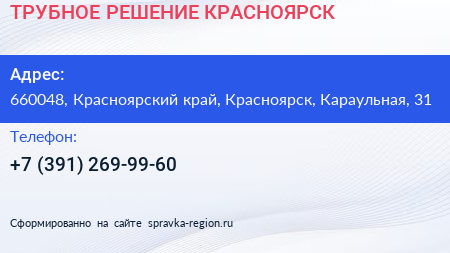 ТРУБНОЕ РЕШЕНИЕ КРАСНОЯРСК по адресу 660048, Красноярский край, Красноярск, Караульная, 31 в дальнейшем Организация, размещена в следующих категориях: