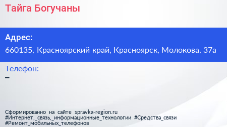 Тайга Богучаны по адресу 660135, Красноярский край, Красноярск, Молокова, 37а в дальнейшем Организация, размещена в следующих категориях: