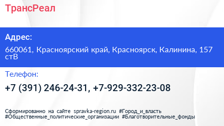 ТрансРеал по адресу 660061, Красноярский край, Красноярск, Калинина, 157 стВ в дальнейшем Организация, размещена в следующих категориях: