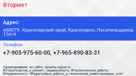 Втормет по адресу 660079, Красноярский край, Красноярск, Лесопильщиков, 156/4 в дальнейшем Организация, размещена в следующих категориях: