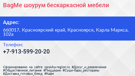 BagMe, шоурум бескаркасной мебели по адресу 660017, Красноярский край, Красноярск, Карла Маркса, 102а в дальнейшем Организация, размещена в следующих категориях: