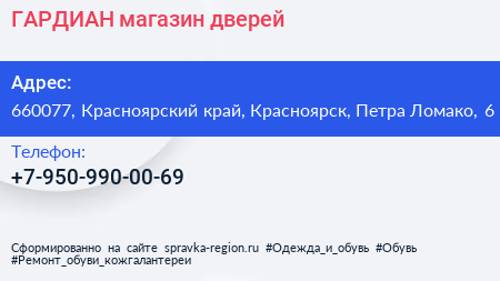 ГАРДИАН, магазин дверей по адресу 660077, Красноярский край, Красноярск, Петра Ломако, 6 в дальнейшем Организация, размещена в следующих категориях: