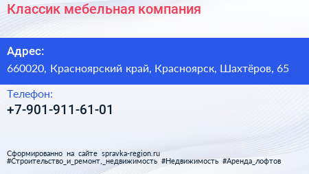 Классик, мебельная компания по адресу 660020, Красноярский край, Красноярск, Шахтёров, 65 в дальнейшем Организация, размещена в следующих категориях: