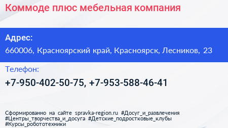 Коммоде плюс, мебельная компания по адресу 660006, Красноярский край, Красноярск, Лесников, 23 в дальнейшем Организация, размещена в следующих категориях: