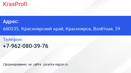 KrasProfi по адресу 660135, Красноярский край, Красноярск, Взлётная, 59 в дальнейшем Организация, размещена в следующих категориях: