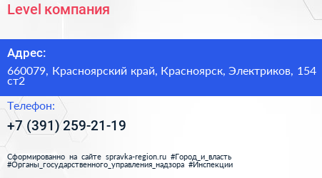 Level, компания по адресу 660079, Красноярский край, Красноярск, Электриков, 154 ст2 в дальнейшем Организация, размещена в следующих категориях:
