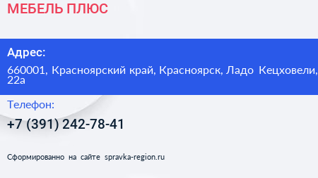 МЕБЕЛЬ ПЛЮС по адресу 660001, Красноярский край, Красноярск, Ладо Кецховели, 22а в дальнейшем Организация, размещена в следующих категориях: