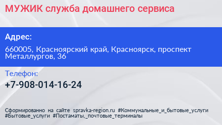 МУЖИК, служба домашнего сервиса по адресу 660005, Красноярский край, Красноярск, проспект Металлургов, 36 в дальнейшем Организация, размещена в следующих категориях: