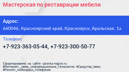 Мастерская по реставрации мебели по адресу 660046, Красноярский край, Красноярск, Аральская, 1а в дальнейшем Организация, размещена в следующих категориях: