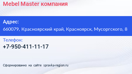 Mebel-Master, компания по адресу 660079, Красноярский край, Красноярск, Мусоргского, 8 в дальнейшем Организация, размещена в следующих категориях: