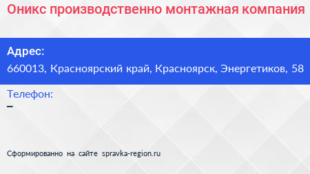 Оникс, производственно-монтажная компания по адресу 660013, Красноярский край, Красноярск, Энергетиков, 58 в дальнейшем Организация, размещена в следующих категориях: