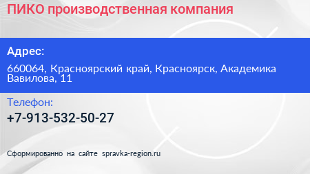 ПИКО, производственная компания по адресу 660064, Красноярский край, Красноярск, Академика Вавилова, 11 в дальнейшем Организация, размещена в следующих категориях:
