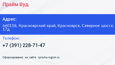 Прайм Вуд по адресу 660118, Красноярский край, Красноярск, Северное шоссе, 17д в дальнейшем Организация, размещена в следующих категориях: