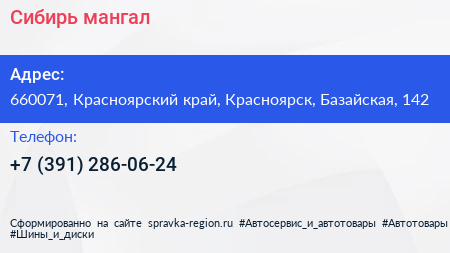 Сибирь мангал по адресу 660071, Красноярский край, Красноярск, Базайская, 142 в дальнейшем Организация, размещена в следующих категориях: