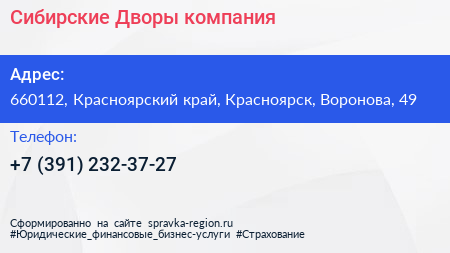 Сибирские Дворы, компания по адресу 660112, Красноярский край, Красноярск, Воронова, 49 в дальнейшем Организация, размещена в следующих категориях: