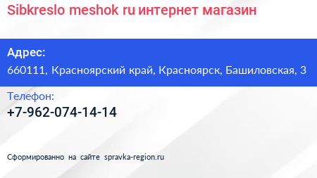 Sibkreslo-meshok.ru, интернет-магазин по адресу 660111, Красноярский край, Красноярск, Башиловская, 3 в дальнейшем Организация, размещена в следующих категориях: