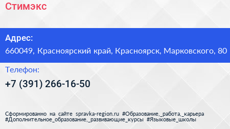 Стимэкс по адресу 660049, Красноярский край, Красноярск, Марковского, 80 в дальнейшем Организация, размещена в следующих категориях: