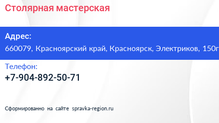 Столярная мастерская по адресу 660079, Красноярский край, Красноярск, Электриков, 150г в дальнейшем Организация, размещена в следующих категориях: