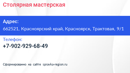 Столярная мастерская по адресу 662521, Красноярский край, Красноярск, Трактовая, 9/1 в дальнейшем Организация, размещена в следующих категориях: