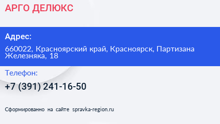 АРГО-ДЕЛЮКС по адресу 660022, Красноярский край, Красноярск, Партизана Железняка, 18 в дальнейшем Организация, размещена в следующих категориях: