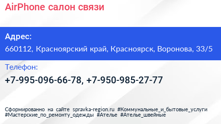 AirPhone, салон связи по адресу 660112, Красноярский край, Красноярск, Воронова, 33/5 в дальнейшем Организация, размещена в следующих категориях: