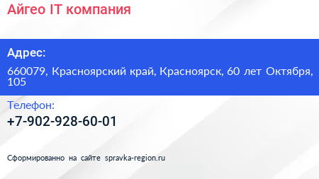 Айгео, IT-компания по адресу 660079, Красноярский край, Красноярск, 60 лет Октября, 105 в дальнейшем Организация, размещена в следующих категориях: