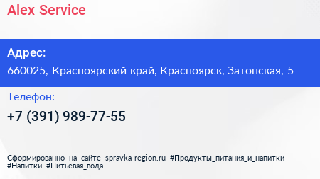 Alex Service по адресу 660025, Красноярский край, Красноярск, Затонская, 5 в дальнейшем Организация, размещена в следующих категориях: