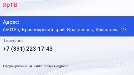 ЯрТВ по адресу 660125, Красноярский край, Красноярск, Урванцева, 27 в дальнейшем Организация, размещена в следующих категориях: