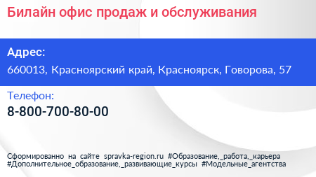 Билайн, офис продаж и обслуживания по адресу 660013, Красноярский край, Красноярск, Говорова, 57 в дальнейшем Организация, размещена в следующих категориях:
