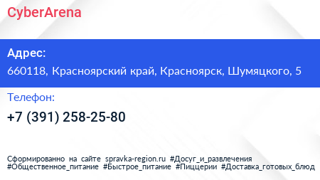 CyberArena по адресу 660118, Красноярский край, Красноярск, Шумяцкого, 5 в дальнейшем Организация, размещена в следующих категориях: