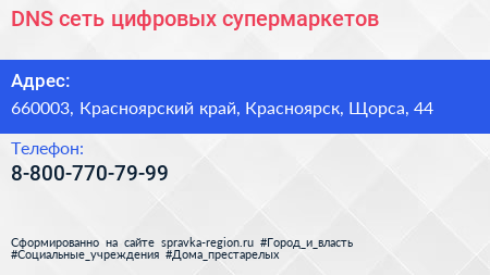 DNS, сеть цифровых супермаркетов по адресу 660003, Красноярский край, Красноярск, Щорса, 44 в дальнейшем Организация, размещена в следующих категориях: