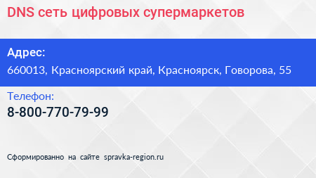 DNS, сеть цифровых супермаркетов по адресу 660013, Красноярский край, Красноярск, Говорова, 55 в дальнейшем Организация, размещена в следующих категориях: