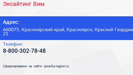 Эксайтинг Вим по адресу 660075, Красноярский край, Красноярск, Красной Гвардии, 21 в дальнейшем Организация, размещена в следующих категориях: