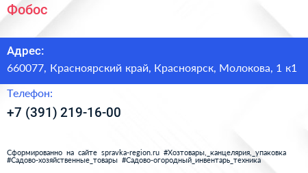 Фобос по адресу 660077, Красноярский край, Красноярск, Молокова, 1 к1 в дальнейшем Организация, размещена в следующих категориях: