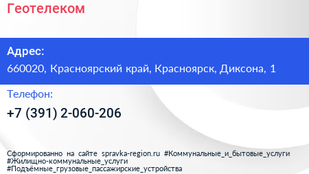 Геотелеком по адресу 660020, Красноярский край, Красноярск, Диксона, 1 в дальнейшем Организация, размещена в следующих категориях: