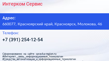 Интерком-Сервис по адресу 660077, Красноярский край, Красноярск, Молокова, 46 в дальнейшем Организация, размещена в следующих категориях: