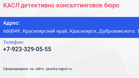 КАСЛ, детективно-консалтинговое бюро по адресу 660049, Красноярский край, Красноярск, Дубровинского, 1 в дальнейшем Организация, размещена в следующих категориях: