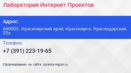 Лаборатория Интернет-Проектов по адресу 660005, Красноярский край, Красноярск, Краснодарская, 22а в дальнейшем Организация, размещена в следующих категориях:
