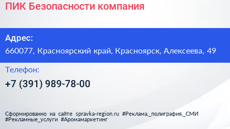 ПИК Безопасности, компания по адресу 660077, Красноярский край, Красноярск, Алексеева, 49 в дальнейшем Организация, размещена в следующих категориях: