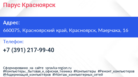 Парус-Красноярск по адресу 660075, Красноярский край, Красноярск, Маерчака, 16 в дальнейшем Организация, размещена в следующих категориях:
