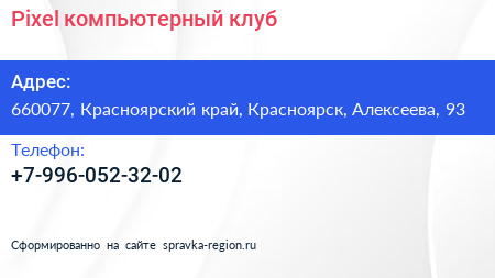 Pixel, компьютерный клуб по адресу 660077, Красноярский край, Красноярск, Алексеева, 93 в дальнейшем Организация, размещена в следующих категориях: