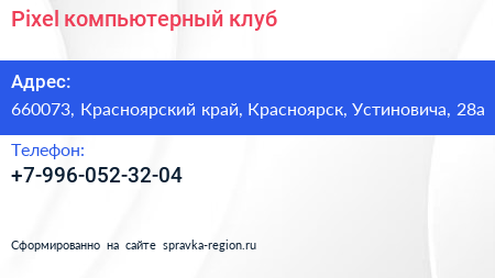 Pixel, компьютерный клуб по адресу 660073, Красноярский край, Красноярск, Устиновича, 28а в дальнейшем Организация, размещена в следующих категориях: