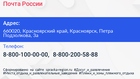 Почта России по адресу 660020, Красноярский край, Красноярск, Петра Подзолкова, 3а в дальнейшем Организация, размещена в следующих категориях: