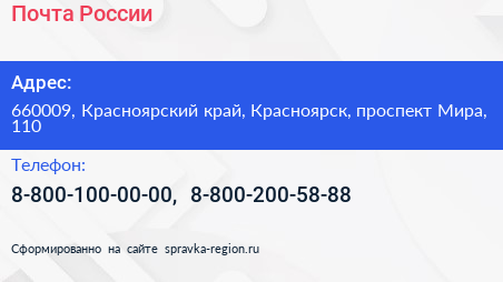 Почта России по адресу 660009, Красноярский край, Красноярск, проспект Мира, 110 в дальнейшем Организация, размещена в следующих категориях:
