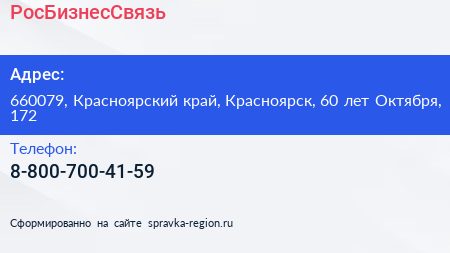 РосБизнесСвязь по адресу 660079, Красноярский край, Красноярск, 60 лет Октября, 172 в дальнейшем Организация, размещена в следующих категориях: