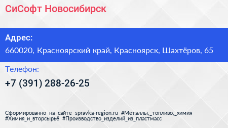 СиСофт Новосибирск по адресу 660020, Красноярский край, Красноярск, Шахтёров, 65 в дальнейшем Организация, размещена в следующих категориях: